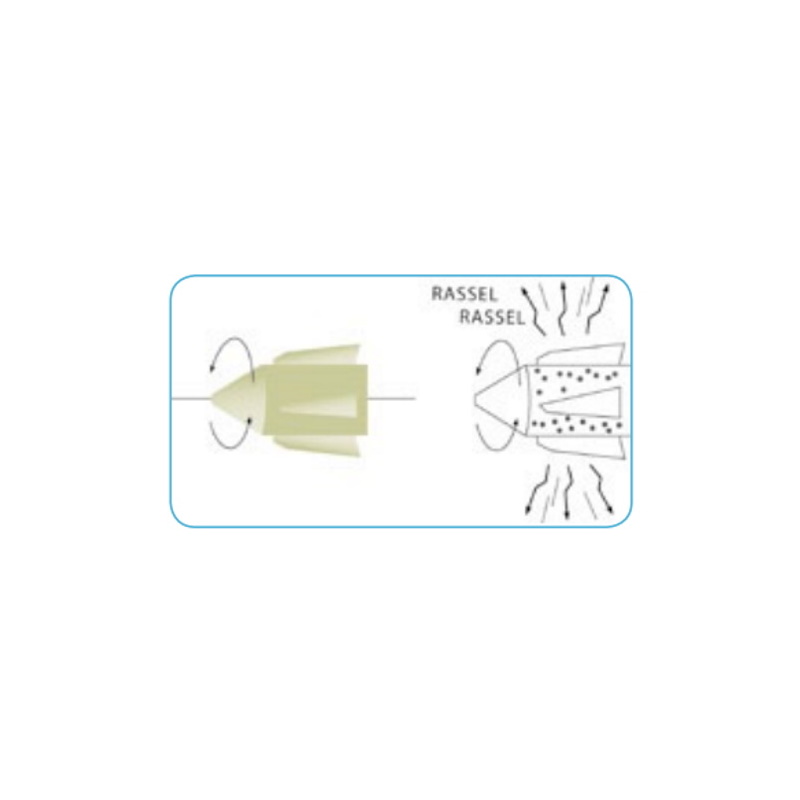Strömung greift in die Flügel und lässt die Rassel drehen. Dabei machen die