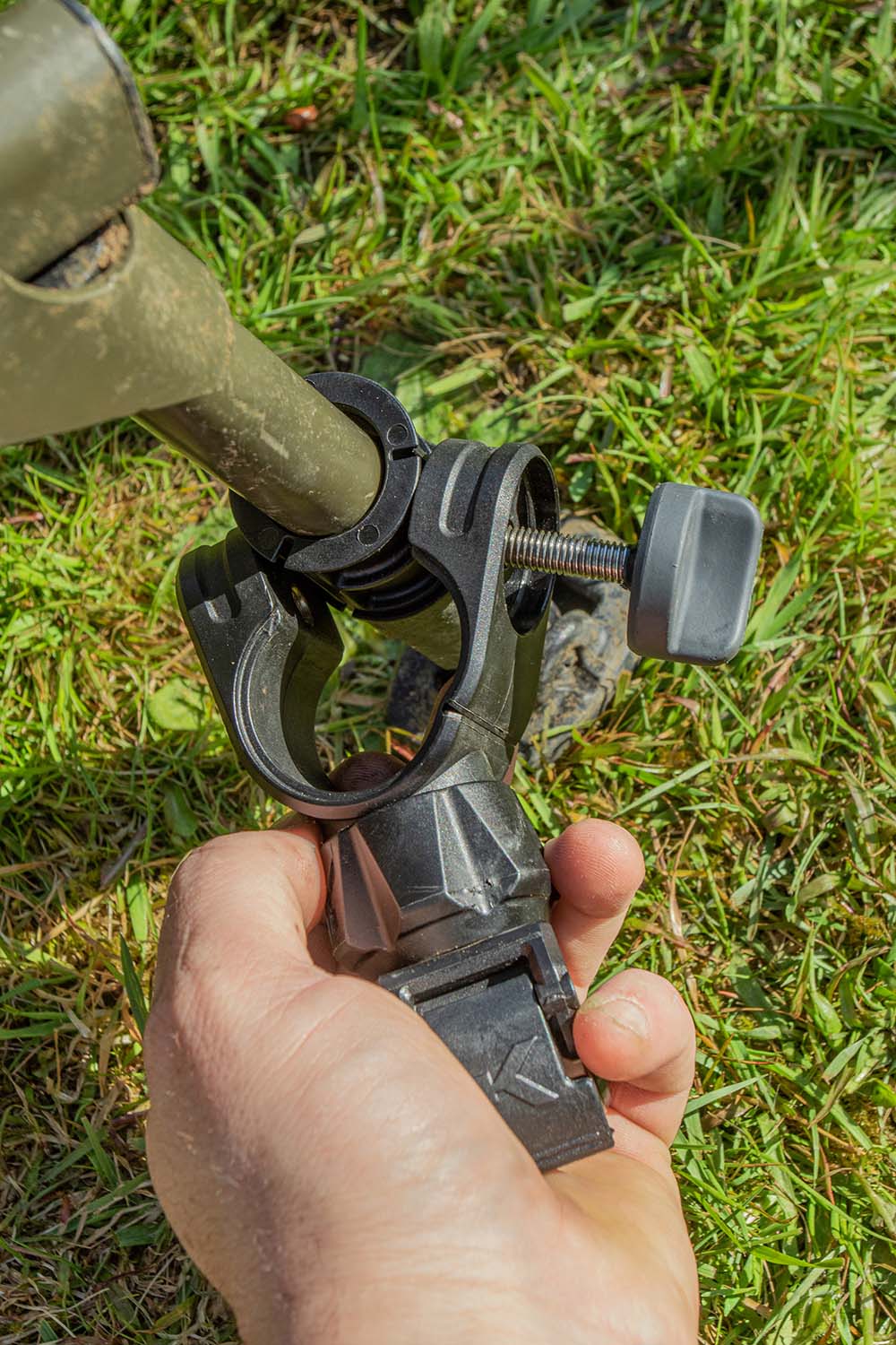 Einfach den Verschluß-Knauf öffnen um die Haltevorrichtung am Stuhlbein anzubringen,